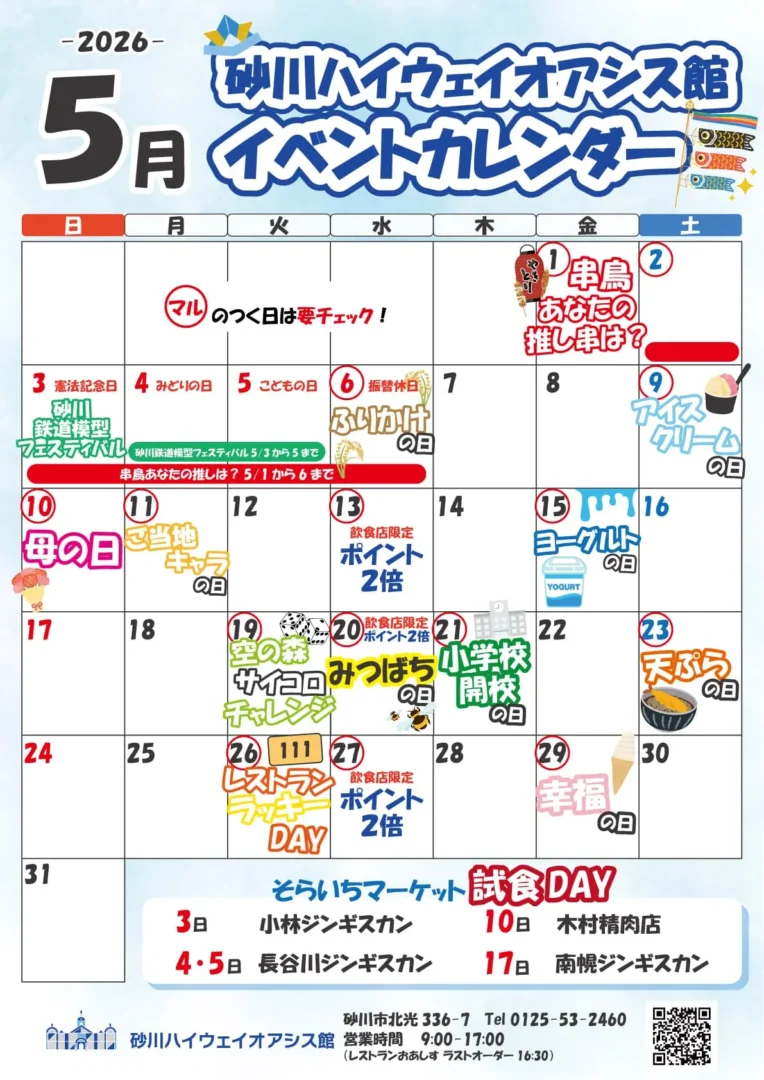 5月のそらいちマーケットでは、お店自慢のジンギスカンやホルモンをその場で焼き上げ、皆様にご試食いただく「試食販売DAY」を開催いたします。